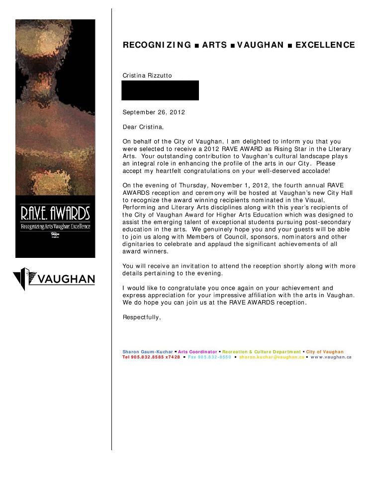 It has been a wonderful year, a year of accomplishment, discovery, and change, and I’m so happy to wrap it all up in Montreal this weekend. Thank you to all who have been coming out to my bookish events throughout 2012 – it means a lot to me. And to the many random, supportive people who stopped to chat and pick up a copy, thanks for sharing your stories and reading mine. I’m thrilled to announce that this month I was awarded the City of Vaughan 2012 RAVE Award: Rising Star in the Literary Arts! It is such an honour to have been chosen, and I look forward to continuing to enhance the arts in my own community. Check out the article here. If you are in Montreal on November 19, come visit me at Paragraphe Bookstore (2220 McGill College Avenue) at 7 p.m.